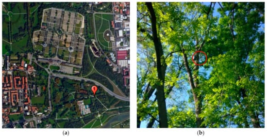 (a) Google Earth image of ‘Parco Nord’ location (Milan) selected for the sound recording (site A); (b) SET unit mounted on a tree.