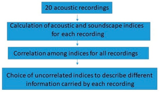 In order to obtain more insights into the use of acoustic and eco-acoustic indices, and to figure out the most representative ones that are suitable to highlight the sensitivity among different environmental and biophonic conditions, we decided to adopt an approach that was as independent of the analyst as possible. For each sound clip (described in Table 1), the temporal analysis of DSC, ACI, ADI, AEI, BI, and NDSI was calculated. The time resolution of each time series was set at 0.1 s for all of the indices except NDSI, for which 1 s was chosen because it could not be calculated at a higher time resolution due to the ‘soundecology’ package’s constraints. The first selection among the indices can be obtained by calculating the correlation among the time series corresponding to each of the indices with the same time resolution. In this case, the idea is to retain only those indices which have a low correlation, and which therefore carry different/independent information. The scheme of the adopted method is illustrated in Figure 2. Two time series are considered correlated when their Pearson’s correlation coefficient is greater than 0.4 (absolute value). We recall the definition of Pearson’s correlation coefficient between two time series s(t) and s’(t) as the ratio between the covariance—cov(s, s’)—of the two time series and the product of their standard deviations, , :