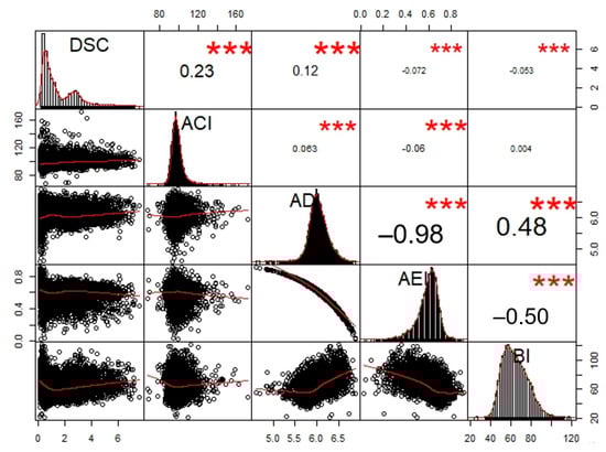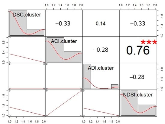 The results of the correlation analysis obtained according to Pearson’s method (see Equation (1) are reported in Figure 3. The outcome of the analysis suggests the keeping of DSC, ACI and ADI as low-correlated indices. NDSI was also considered, as it cannot be included in the correlation analysis.