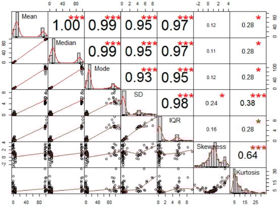 Another important issue regards the identification of the most representative statistical metrics describing the distribution of the values of each index. For this purpose, seven descriptors were considered: the mean value, median, mode, standard deviation (SD), interquartile range (IQR), skewness, and kurtosis. The choice was also determined, in this case, by calculating the correlation analysis based on Pearson’s method, and keeping those with low correlation.