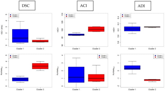 Figure 6 shows the box plots of the two metrics (mean and kurtosis) in the two clusters obtained for each index (NDSI excluded, because its cluster membership is strongly correlated to that of ACI). For the DSC and ADI indices, the kurtosis can separate the two clusters quite well, whereas this happens for the mean value for the ACI index. The clusterization for DSC based on the mean and kurtosis variables shows that cluster 1 (16 recordings) shows a median value slightly above 1 kHz, but with a high variability. This explains why many sites with completely different characteristics are included in the same group. The kurtosis of about 1 indicates a platykurtic distribution. Cluster 2 (only 4 recordings) shows lower values of DSC (around 500 Hz) but a high kurtosis (around 3), and thus has a normal distribution. This result seems to suggest that the discrimination among the recordings is not satisfactory, since it does not reveal significant differences among the recordings.