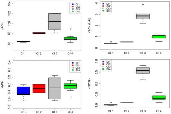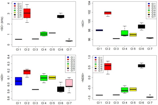 The split of recordings is in quite good agreement with the four sites, with some exception due to the differences within each site. The boxplot of the mean values for each index in the four clusters is given in Figure 7. Cluster 1 is mainly composed of recordings belonging to Site A (4 out of 5), in addition to clip #15 belonging to Site C. They are characterized by very low values of ACI, meaning low sound modulation, which is typical of road traffic noise, low mean SC values (<500 Hz), and a mean NDSI very close to −1, indicating the prevalence of anthropogenic noise sources. The mean value of the ADI index is almost the same for all of the clusters and, therefore, it does not provide additional information. Cluster 2 is very similar to cluster 1, but with a slightly higher value of mean ACI. It is made up of just two recordings. Cluster 3 is made up of 6 sound clips belonging to Site B, in addition to clip # 17. This cluster has the same composition as the one found in the previous analysis with two clusters. It is characterized by higher values of mean ACI, SC and NDSI, emphasizing the presence of biophony with a larger sound modulation, higher frequencies, and low values of road traffic noise background. Cluster 4 presents similar mean index values to clusters 1 and 2, but with slightly higher values of mean SC and NDSI, indicating the presence of more biophonic activity. Surely, in the clustering process formation, the kurtosis is also involved, meaning that the distribution of the index in each recording is also an important clustering factor.