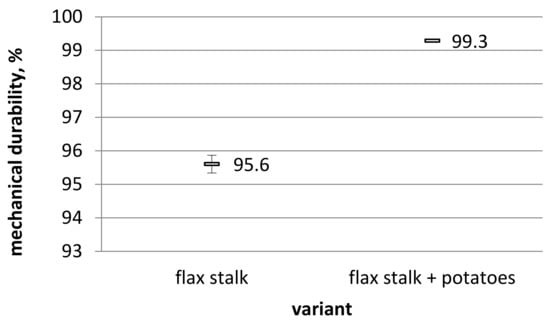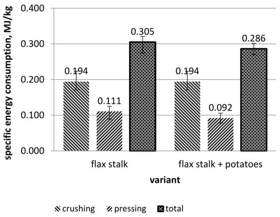 The specific energy consumption and the performance of the MGL 200 pressing line when pressing the pellets were different for the tested variants. The difference in performance was caused by a larger number of fractions and debris in the output of the press. They fell through the cooler sieve and were not part of the final product. The specific energy consumption ranged from 0.089 to 0.125 MJ/kg when only flax stalks without potatoes were pressed. The efficiency of the line when pressing the stalks without potatoes was 123 ± 15 kg/h. Meanwhile, when pressing the flax stalks with the addition of potatoes, the specific energy consumption ranged from 0.078 to 0.106 MJ/kg and the efficiency value increased to 146 ± 12 kg/h. The values for the individual variants are graphically presented in Figure 2.