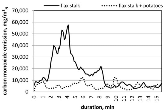 Carbon monoxide, NOx, and carbon dioxide emissions were measured during the combustion tests. The values were converted to a reference oxygen content of 10%. The largest difference in the measured emission concentrations found in carbon monoxide was in favor of the variant with potatoes (13,082 mg/m3N for the potato-free variant and 5186 mg/m3N for the variant with potatoes). This was especially the case in the initial phase of combustion. In other cases, the results obtained were similar. Moreover, similar or lower values were obtained in comparison to the values reported in the literature.