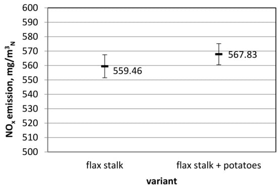 The results of the combustion tests show that the combustion of pellets with the addition of potatoes resulted in a higher concentration of carbon monoxide emissions, especially in the initial phase of combustion. The emission concentrations of other measured gases (i.e., NOX and carbon dioxide) were different in both variants. Compared with the results of other researchers, lower NOx values were found [22]. However, on closer comparison, only NO is included in the NOx emissions. In addition, the authors’ results are converted to an oxygen content of 10%.