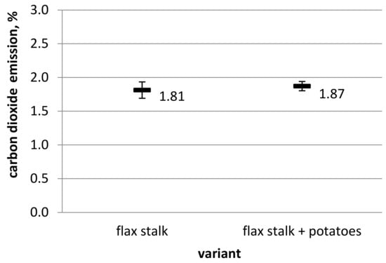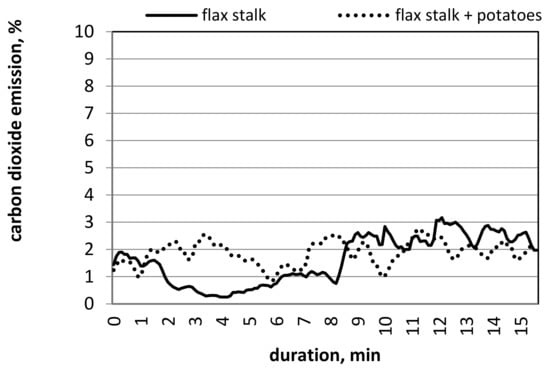 The carbon dioxide emissions (Figure 10) also did not show a significant difference in average values (1.81% for the variant without potatoes and 1.87% for the variant with potatoes). As in the case of NOx emissions, the range of measured values was narrower for the latter, which supports the assumption of a better combustion process stability for the potato variant. Graphical representation of the emission concentrations during the combustion test (Figure 11) shows an evident decrease in carbon dioxide emissions concentration in the first half of the test, which corresponds to an increase in the concentration of carbon monoxide emissions.
