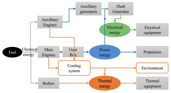 Using a typical chemical tanker as an example, a ship can be represented as a complex energy system, as shown in Figure 1. In this energy system, the ultimate source of energy is from the chemical energy released through the combustion of fuel. The main engine, auxiliary engine, and boiler are three fuel-related devices that interact with the other shipboard equipment to provide various energies for the entire ship. The daily driving of the ship mainly depends on the power provided by the main engine. It transmits the power to the propeller through a gearbox. The power generated by the auxiliary engine drives the generator set; the electricity generated by the generator set is used throughout the ship. The boiler is mainly responsible for providing thermal energy [27].