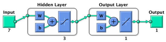 It should be noted that the output of th layer can be taken as the input of the next layer. However, there is no activation function in the output layer of the neural network for the regression problem. When is the output layer, . It denotes the predicted output value. The propagation of the BPNN is to predict the output value of the output layer, that is, the predicted ship energy consumption. Here, a three-layer neural network topology in Figure 2 was simply drawn from MATLAB software to show the process of neural network forward propagation. The number of hidden layer neurons needs to be further determined by input layer neurons and output layer neurons , usually as shown in Equation (3). The constant is 1 minus 10.