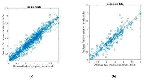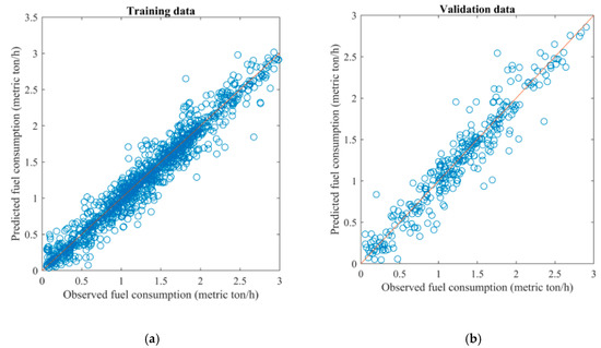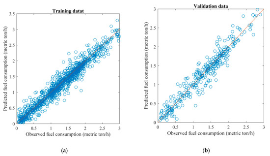 The fit of observed and predicted fuel consumption using backpropagation neural network BPNN for training data (a) and validation data (b).
