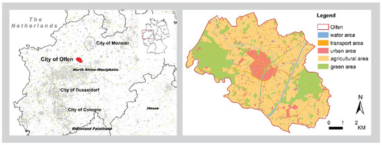 Area of investigation: (left) location of the city of Olfen in the state of North Rhine-Westphalia, Germany; (right) urban structure of the city of Olfen.