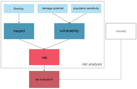 The following approach is based on the risk understanding of the Intergovernmental Panel on Climate Change (IPCC) and the United Nations Office for Disaster Risk Reduction (UNISDR) [3,51], which defines risk as the result of the combination of hazard and vulnerability. The approach (see Figure 2) focuses on these two components which determine the risk: hazard and vulnerability. The component of exposure was not directly taken into account because the approach aimed at the identification of spatial hotspots for flash flood risks at a citywide level. Therefore, exposure was already integrated when analysing the vulnerability. On the contrary, indirect effects may take place outside the directly exposed area due to disruptions of infrastructure services. Criticality was excluded from the vulnerability component, because we used a place-based concept. However, criticality should be considered as an important factor when evaluating the given risk and defined priorities for risk management [52].