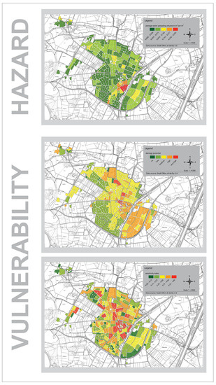 Within the following approach, two dimensions of vulnerability are considered: physical vulnerability and social vulnerability. When providing guidelines for planning, it is always important to focus on more than one dimension of vulnerability. Urban pluvial flooding can lead to material (e.g., damage to property, buildings), immaterial (personal injury, environmental damage, damage to cultural assets) and indirect damage (failure/impairment of systemic function) [54,55]. The hazard analysis identified areas that are potentially affected in the event of a heavy precipitation event. In addition to the hazard, however, the vulnerability must also be considered, which refers to damage potentials of the objects located within the endangered areas as well as the inhabitants (and their sensitivity) located in these areas. The determination of the component of vulnerability focuses on two aspects: damage potential, as a representative for physical vulnerability, and the population sensitivity, as a representative for social vulnerability.