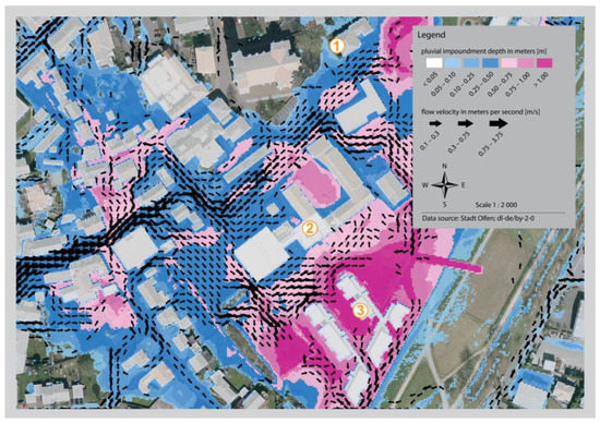 These results take on particular significance in combination with urban vulnerabilities, since this is where, for example, school locations and residential and care facilities for the elderly are affected. Particularly sensitive groups of the population and facilities worthy of protection may be affected, so that it is advisable to consider individual buildings and infrastructure. For this purpose, hazard profiles were drawn up for all social and critical infrastructures in Olfen. The numbered buildings in Figure 4 show a church institution (1), a primary school (2) and a retirement home (3). All three facilities are located in a large area with a high to very high hazard value. In some places, water spreading volumes from max. 50 cm (church facility) up to more than one metre (retirement home), even directly at the building structure, can occur. This means that the accessibility of the facilities can be severely restricted in the event of heavy rainfall. In addition, high flow velocities of up to 0.75 m/s need to be expected. The hazard profile shown here is a particularly affected hotspot in the city of Olfen. Due to the concentration of highly sensitive infrastructures in this area, it is recommended to adapt the current utilisation concepts to the expected effects of heavy rainfall.