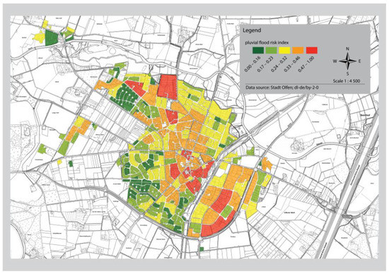 The final pluvial flood risk assessment consists of the combination of all analysis components. In a final step, the determined hazard and vulnerability were combined to obtain the pluvial flood risk. Therefore, both components were additively linked together and again normalised via a min–max normalisation. The linking was carried out additively, as there is no building block in the city area that is neither at hazard nor vulnerable. As a result, the objectively determined risk could also be visualised on a pluvial flood risk map for the city of Olfen. The overlapping of flood hazard with the vulnerability components results in the pluvial flood risk. Only the combination of the information in the spatial risk allows an assessment of the situation on site, since a hazard situation without the presence of the vulnerability or a high vulnerability without hazard does not represent a risk [54]. For the identification of hotspots, which are used for further consideration and derivation of options for action and measures, it is imperative to use maps of flood hazard and vulnerability in parallel, since information can be lost when damage potential and hazard are intersected [57].