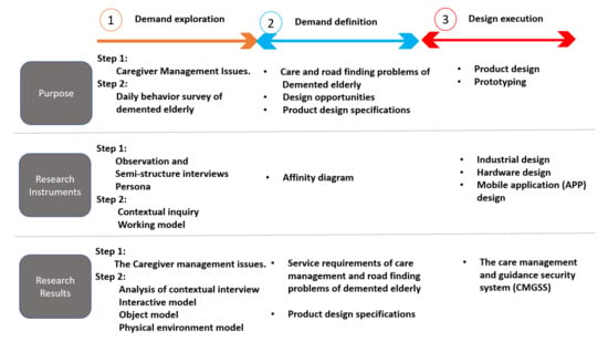 In the stages of demand exploration and demand definition, potential and unmet requirements were formed, and the design policy and product architecture of the prototype were integrated. In the process of implementation, the contextual inquiry and service molding of the service experience engineering were applied; users and stakeholders were regarded as partners in the process of product development. In the contextual inquiry, the service model and customer journey map were used to determine obstacles and opportunities when the service providers (or stakeholders) were in the environment and when there were activities, interaction, and the use of objects, through the contact points with the main users or service providers. In the demand definition stage, the affinity graph method was used to define the potential requirements. Through the integration, discovery, and exposure of opportunity points, the design policy and product architecture specifications were summarized. In the design execution stage, (1) interdisciplinary teams were recruited to carry out prototype design and functional model production, and (2) technical feasibility experiments were carried out as shown in Figure 1.