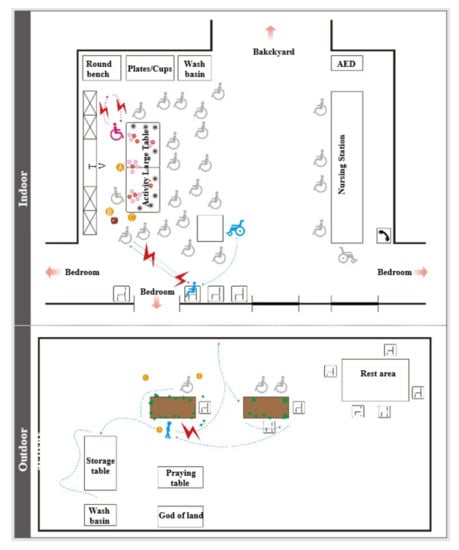 - Environment model: It is a field of daily activities in the care center. It can describe the spatial functional layout and structure of daily behavior. According to the purpose and method of use, as well as the activity route of the case in the environment, various related objects are presented. For example, Figure 2 [] showed the behavior of the patient engaging in gardening activities indoors and outdoors. It included indoor and outdoor planting activities, wheelchairs pushed by patients and caregivers, configuration of various gardening tools, and behavior of the patients observed during the activity.