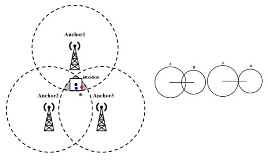 The recording method of this experiment was mainly based on Fujiwara et al.’s time difference of arrival (TDOA) indoor positioning method []. As shown in Figure 3, the anchor calculates the two-way ranging (TWR) distance with the tag at different times, and the gray memory block in the middle is the area where the measurement tag is located. Due to the indoor configuration and the influence of multipath interference, the distance between the anchor and the tag often changes, just as the distance between circle A and circle B changes as shown on the right of Figure 3.