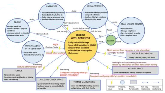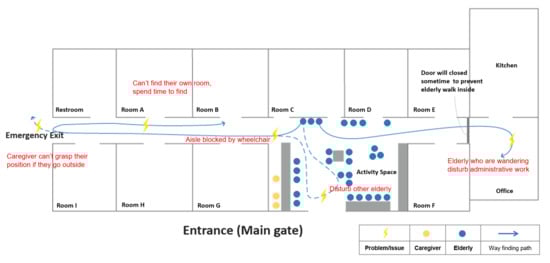 - Interactive model: This model integrated and depicted the interaction mode of people and things encountered by the elderly with dementia in their daily life, as shown in Figure 4. In this study, the cognitively impaired subjects sought the help of caregivers because they could not find their destination (such as the living room). In view of the occurrence of wandering events, caregivers made irregular inspections to confirm the position of each elder. However, such decision making could not monitor the movement of the cognitively impaired elderly in a timely manner and prevented the elderly from leaving the care environment uncontrolled.