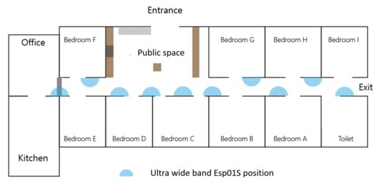 - Monitoring system: The system uses multiple ultra-wide band devices, installed in the environment, to detect the patient’s smart watch and to transmit the patient’s number and position (Figure 11). Through the preset coordinates and the calculation of the triangulation method, the location of the patient in the environment is transmitted back to the monitoring screen of the care manager (Figure 11). The caregiver is notified if the patient does not act in accordance with their chosen purpose, or if they begin wandering in the environment. The monitor screen displays the overall indoor map of the care environment and the number of people in each area (room, corridor, activity space, etc.). The daily activities of the patient are recorded and transmitted back to the family members through the mobile application.