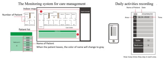 The first purpose of the interview was to understand the current situation of caregiver management by interviewing the social workers in the caregiver center who are currently taking care of the dementia patients and other elderly patients. The second purpose was to understand the behavior of caregivers in caring for the patients’ daily activities such as toileting, drinking water, dining, etc. The four interviewees included three female caregivers and one male social worker. The care management issues noted mainly involved the following five points: (1) insufficient care manpower: each caregiver was required to care for eight patients, and thus the needs of patients were ignored; (2) over-reliance on caregivers; (3) inability to immediately grasp the patient’s problems because of human problems, with patients going to the toilet, drinking water, or walking on their own, resulting in care safety problems; (4) guidance labeling problems: some patients with mild dementia went to the toilet or for a drink by themselves, but they were unable to return on their own; (5) active regional cognition: assisting patients in identifying public areas and private areas could reduce the difficulty of care management.