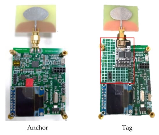 This study used UWB technology positioning system architecture [], ESP-01S module, as shown in Figure 12. This module can provide wireless network transmission that can be set as an anchor or a tag. The anchor is set-up in an indoor space to detect the location of the tag, which is worn on the patients with dementia. The distance between the anchor and tag is calculated by the two-way ranging method, and then all the data are aggregated to the display terminal for positioning. The UWB software architecture used the Keil MKD-ARM platform, and Keil uVision 4 was recently launched, which provides a good debugging interface to help master related issues. During the experiment, UWB will transmit the positioning value (x, y) to the mobile phone and record it.