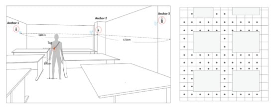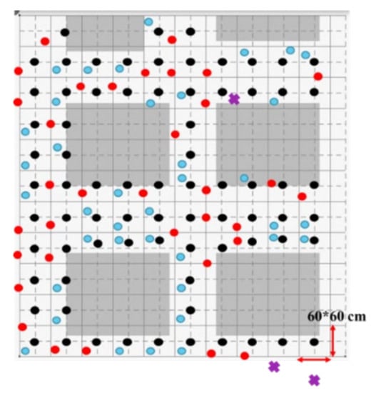 Finally, Equations (7) and (8) were applied in the program. When the mobile phone receives the distance between each anchor and the tag, it can calculate the tag position (X0, Y0). As shown in Figure 3, when the tag position overlaps with the black dot marked by the floor tile, a black spot is recorded. If the value is within the set range of 60 × 60 cm, a blue dot is recorded. If it is on the boundary line, it is recorded as a red dot; if it is outside the range, it is recorded as a purple point.