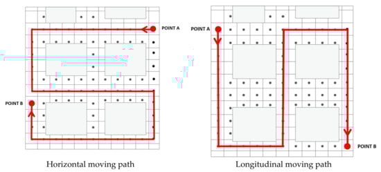 In the indoor positioning dynamic experiment, the experiment participant wore the tag and moved one space every 1 s along the black spots, following the path from point A to B. The three anchors detected the position of the tag passing through each certain point and recorded the indoor dynamic position. The moving path was divided into a horizontal moving path and a longitudinal moving path as shown in Figure 14.