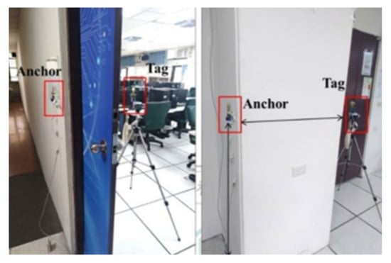 In this experiment, the penetration of the UWB was tested with two thicknesses, i.e., a wall thickness of 18 cm and a column thickness of 83 cm. As shown in Figure 15, the tag and anchor were respectively placed on both sides of the wall, approximately 130 cm above the ground, to detect the penetration of the UWB [].