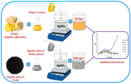 Alkhathlan, A.H.; AL-Abdulkarim, H.A.; Khan, M.; Khan, M.; AlDobiy, A.; Alkholief, M.; Alshamsan, A.; Alkhathlan, H.Z.; Siddiqui, M.R.H. Ecofriendly Synthesis of Silver Nanoparticles Using Aqueous Extracts of Zingiber officinale (Ginger) and Nigella sativa L. Seeds (Black Cumin) and Comparison of Their Antibacterial Potential. Sustainability 2020, 12, 10523. https://doi.org/10.3390/su122410523