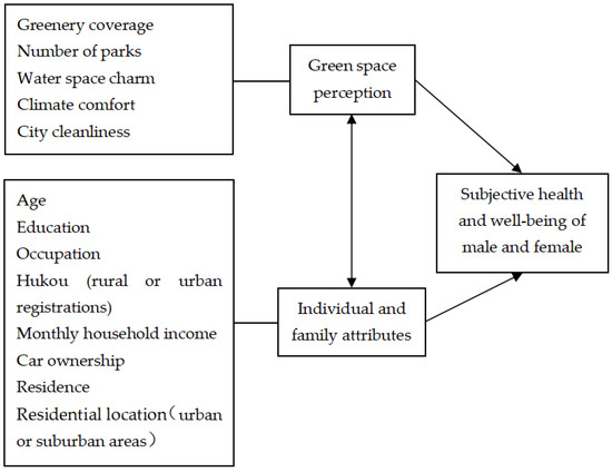 Furthermore, current urban greening literature rarely refers to the UN 2030 Agenda [24] and the UN New Urban Agenda (NUA) [25]. The 2030 Agenda provides guidance for countries to achieve sustainable development goals (SDGs) by 2030 [24]. Interconnected and interdependent, many of the 17 SDGs are directly or indirectly related to urban greening. For example, SDG 11 requires the provision of “universal access to safe, inclusive and accessible, green and public spaces,” as urban greening contributes to the development of sustainable, inclusive cities and communities (SDG 11) and climate actions (SDG 13). In addition, SDGs 3 and 5 stress the need to “ensure healthy lives and promote well-being for all” as well as to “achieve gender equality and empower all women”. The NUA provides a new road-map for sustainable urban development. It was designed to support the achievement of the 2030 Agenda SDGs, particularly SDG 11. As such, the NUA follows the same inclusive theme as the 2030 Agenda to ensure equity, health, and well-being for all. It is critical that sustainable urban greening is guided by these UN Agenda. The aim of this study was to examine the effect of green space perception on subjective health and well-being with attention to gender inequalities in the context of the UN Agendas. This paper specifically intends to answer three questions: (1). Are there gender differences, or other differences, in perceived green space and self-rated health and well-being? (2). How do perceived green space, personal, and family variables affect subjective health and well-being? (3). What are the interactive effects of perceived green space, personal, and family variables on subjective health and well-being? Answers to these questions will provide valuable knowledge and contribute to better understanding of sustainable urban greening that will help ensure healthy lives and well-being for all genders. There are many definitions of perception. Our definition here is the understanding or recognition of something, a mental impression. “Perceived” means “recognized through the senses” (https://www.merriam-webster.com/dictionary/perceived). It is used in this paper interchangeably with “recognized” and “recognition” to refer to the overall perception of green space quality that includes perceived accessibility, size, authenticity, and usefulness of the green space.