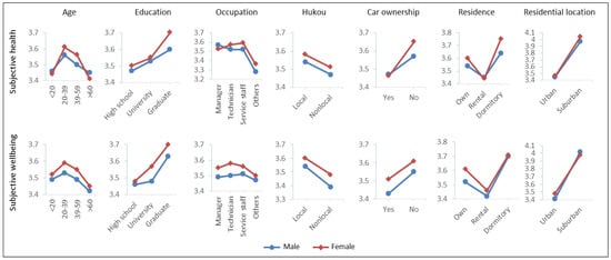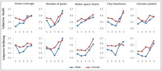 Men’s subjective health is significantly affected by their perception of number of parks, city cleanliness, and greenery coverage (Table 3). However, women’s health is only affected by city cleanliness and number of parks. Male well-being is significantly affected by the number of parks, city cleanliness, climate comfort, greenery coverage, and water space charm. On the other hand, female well-being is affected by only the number of parks, water space charm, and climate comfort. Four individual and family attributes are important to male health: residential location, age, car ownership, and Hukou. However, female health is affected by a greater number of factors. In addition to residential location, age, car ownership, and Hukou, female health is also impacted residence, education, and occupation. Male well-being is affected by residential location, residence, education, age, Hukou, and car ownership. Female well-being is affected by the same attributes with the addition of occupation. In sum, the factors of green space perception and individual and family attributes have a greater impact on well-being than health. Green space perception factors have a greater impact on men than women, who particularly care more about the number of parks. Women also tend to be more affected by individual and family factors than men.
