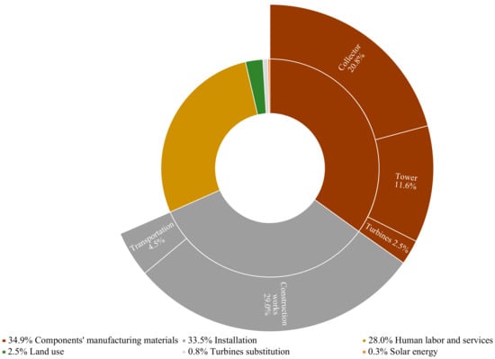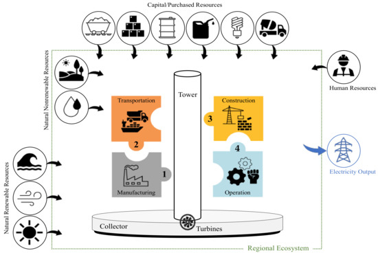 The studied SUT power plants consist of concrete towers and glass solar collectors. The data in this study are mainly from the feasibility and lifecycle assessment reports of large-scale SUT. The total area of the canopy is considered the plant area, at a site with an annual global solar radiation of 2300 kWh/m2/year [22]. The total masses and the electricity consumption for the construction of the tower and collector are adapted from the sample estimates of W. Haaf et al. [21]. Turbines’ materials are calculated by analogy with similar wind turbines [34]. During the operation and maintenance phase, it is assumed no replacement of the tower or collector is taking place [29]. Meanwhile, one-third of the turbine’s materials should be substituted during the average useful life [33,34]. Labor and services costs for installation (engineering, tests, etc.) and operation and maintenance are derived from [22]. In the calculation, considering the energy and materials loss in the production process, and due to the difficulty of getting data, some calculations are still not included [16]. The solar transformity coefficients of each resource are quoted from relevant references.