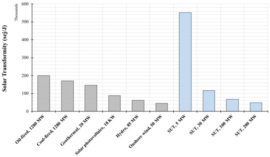 Transformity () is an important indicator to measure the overall efficiency of the production system at the biosphere scale. Power plants with greater transformities demand more environmental and economic resources to meet the same electricity demand. Large-scale SUT power plants are excellent in terms of emergy conversion, except for very small generation capacities. The transformity of onshore wind energy and SUT, 200 MW is found to be the lowest among all conventional and renewable generation technologies presented in this research (Figure 4). Further, it is the closest in value to the thermodynamic minimum transformity for electricity production cycles [3]. This is an outcome of the simplicity of this technology as its materials are very conveniently based on environmentally sound production from renewable or recyclable materials.