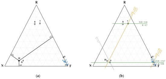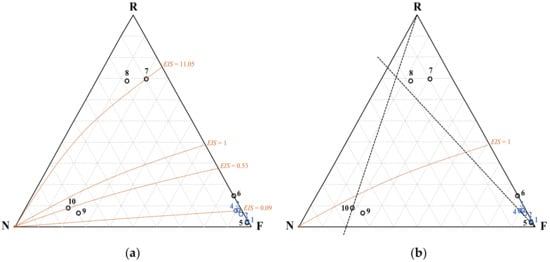 Emergetic ternary diagrams representing SUT and various power generation systems shown in Table 5. (a) represents the composition of point #10 (coal-fired, 1280 MW) and (b) the use of resource flow lines (: emergy yield ratio; : environmental loading ratio).