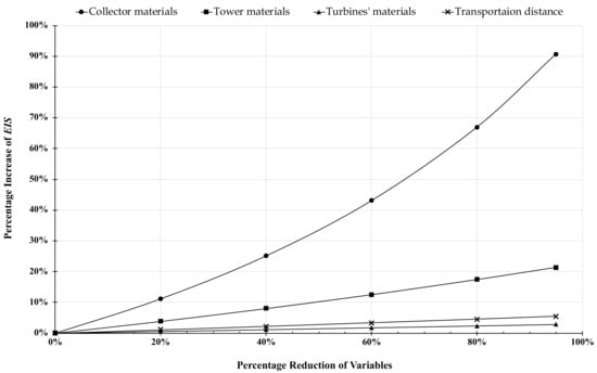 Percentage increase in EIS of SUT, 200 MW with the reduction of the tower, collector, and turbines’ materials, as well as transportation distance of these materials to the plant’s location.