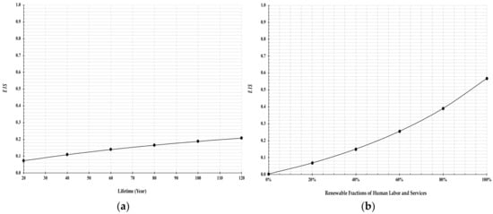 Changes in EIS of SUT, 200 MW with: (a) lifetime length of the power plant and (b) renewable fractions of human labor and services.