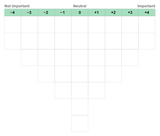 After the pre-sort, participants were then asked to partake in the main sort. As is visible in Figure 1, this Q-sort was designed in a quasi-normal grid that ranged from −4 to +4. Participants were asked to rank the 35 statements according to the prompt “Please sort the statements according to how important they are concerning sustainability of a coworking space. As you can see, the +4 grid denotes the most important factors of sustainability, whilst −4 denotes the least important. Please note that the vertical location of a statement has no meaning, therefore each statement within a value (+4, +3, …) has the same allocated importance” on the −4 to +4 grid. As mentioned, the horizontal position was decisive, but not the vertical one. This means that all statements with the same grid value are assigned the same value irrespective of their vertical position.