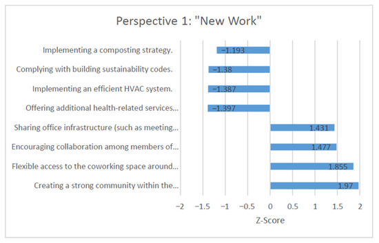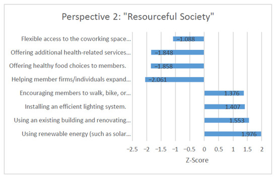 The participants within this perspective found that using renewable energy was the single most important sustainability aspect. Participant 11 elaborated on why this statement is very important to him: “One of the most effective ways to reduce or eliminate the carbon emissions associated with operating a coworking space is to use 100% renewable energy, preferably on site with energy storage”. The statement with the second highest Z-score within this perspective referred to using an existing building instead of building a new one. Participant 16 explained the importance of this: “Nowadays the expected lifespan of an office building is no more than 60 years and often a lot less. So, when reusing an existing building it has major positive impact on sustainability”. The third and fourth highest Z-scores referred to installing an efficient lighting system and encouraging members to walk, bike, or carpool, which gives further insight into this perspective. It is clear that participants that are categorized into this perspective view a sustainable coworking space as one that optimizes its resource use in a sustainable manner. Of the five statements with the highest Z-score, three can be classified within Bocken et al.’s “technological” grouping, whilst two can be classified as “social factors” [24]. This further illustrates the emphasis on resource optimization with a social aspect.