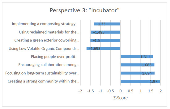 Perspective 3 had eight defining sorts and was coined the “Incubator” perspective, due to its focus on helping the community and the businesses within it grow. Figure 4 shows this emphasis. Participants identified a strong community, a focus on long-term sustainability, encouraging collaboration, and placing people over profit as the statements with highest importance. Participant 19 outlined the importance of a strong community by stating that “This is the heartbeat of a coworking space and is essential for sustaining a viable space.” Participant 26 explained that focusing on long-term sustainability helps strengthen this perspective by stating that a long-term mission would “change the mindset of the people, rather than saving the day”. Participant 8 shines light on the importance of collaboration by stating that “What can be done in a group with someone who is just few meters from you who can offer you counseling, opinion and an idea. In other words. Work better together.” Furthermore, the five statements with the highest Z-scores all belong into the “social” grouping of Bocken et al.’s framework [24]. Thus, the participants within this group believe in the importance of social sustainability. To them, a sustainable coworking space is one that focuses on a sustainable social setting, and less on environmental factors.
