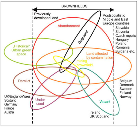 Significant differences in understandings of the meaning of brownfields can be identified in Europe and its regions. Many definitions in the literature differ between disciplines. A review of brownfield definitions from selected scientific communities worldwide is provided in Table 1 and Figure 1.