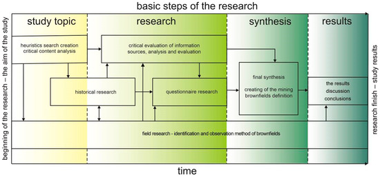 As stated in the theoretical background section, this research is not exclusively methodologically based on the works mentioned above. Theoretical and methodological procedures and results from research on mining brownfields and their secondary use applications for purposes other than tourism (e.g., [10,15,28,29,30,31,32,33,34,35,36,37,38]), although also those concerning mining tourism or tourism in general, were used (e.g., the recent works [6,39,40,41]; for more details, see the theoretical background section). Based on the study of the abovementioned studies, we conducted a search of the latest studies on the researched topic (for more details, see the references section), which we analyze in terms of content in the theoretical background section.