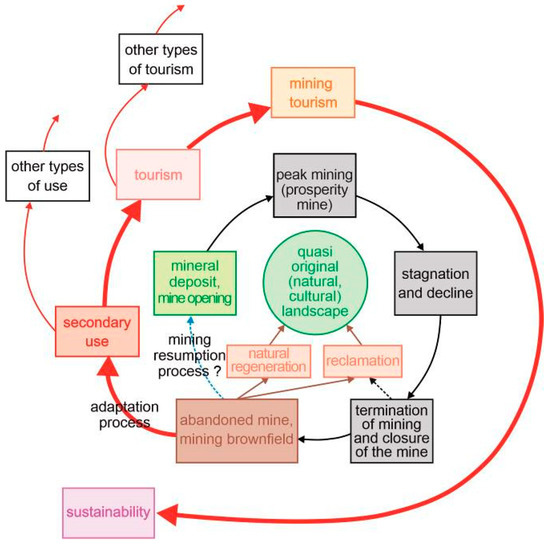 Graphical representation of mining and postmining brownfield transformation process for the secondary use of sites in tourism (source: authors’ research).