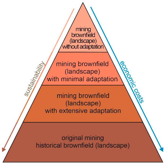 Based on our research, we divided the remediation of mining brownfields for mining tourism into four stages according to the extent of recultivation or adaptation adjustments. We relied on a proven and often used methodical classification of the agricultural landscape in Slovakia based on its historical development through anthropogenic transformation. However, each historical period has given it a specific character, which is why the created phenomena of the cultural landscape are different. The cultural landscape can be understood as a material reality, resulting from the constant impact of man and his activities on the natural landscape [124]. In our case, the cultural landscape is represented by the mining landscape, abandoned mines, and mining brownfields (Figure 5).