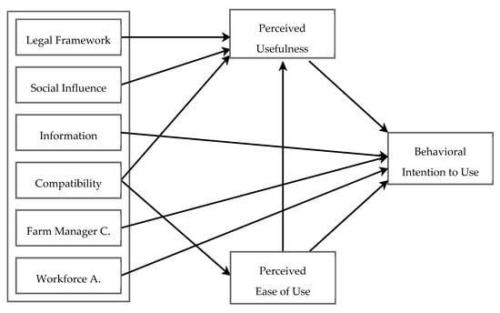 This 14 question-long guide (see Appendix A) was based on the factors influencing the ex ante user acceptance of new technologies based on the Technology Acceptance Model (TAM) []. These factors cover perceived usefulness, perceived ease of use, and external factors. Since the subject of this study is the future use of AFR, it can be assumed that farmers have had little or no experience in dealing with this new technology, which is why the factors of attitude toward using and actual system use have been excluded from this analysis. In addition, Chuttur [] was able to demonstrate a direct influence of perceived usefulness and perceived ease of use on the behavioral intention. According to [], the perceived usefulness is the subjective probability with which a potential user will adopt a certain technology (in this case AFR) to improve his work performance in an organizational context. In contrast, the perceived ease of use describes the level of simplicity of a technology expected by a potential user. Both perceived usefulness and ease of use can be influenced by various external factors [,,,]. In order to address the diversity of perceived usefulness, this study explicitly addresses the underlying facets of an economic benefit in terms of, for example, higher harvest expectations, (labor-) cost savings or an increase in economic efficiency, and the facets of an environmental benefit. The effect of perceived ease of use on perceived usefulness is assumed to be positive, since a higher degree of simplicity of a technology is beneficial to its usefulness [,,,]. The following external factors have been added based on the available literature on the topic: compatibility, farm manager characteristics, information, legal framework, social influence, and workforce availability [,,,,,,,,,]. The external factor compatibility takes findings from diffusion theory into account, which has shown that the technical design strongly influences user acceptance []. Compatibility means the possibility of combining AFR with existing technology and thus, successfully integrating it into working practice. Therefore, we expect an effect on the perceived usefulness and the perceived ease of use. As another external factor, we have introduced the farm manager’s characteristics in order to meet socioeconomic aspects such as age, educational level, and risk aversion []. Following an approach from PA research, the external factor information represents the data collected by AFR and its strategic operational use as well as associated data protection and data autonomy, for which we assume a direct influence on the perceived usefulness. The sociopolitical discussion on chemical plant protection products in Europe is leading to increasing legal restrictions on the use of pesticides in agriculture (e.g., Germany: []). In addition, the use of autonomous technologies on public roads is still not regulated in a way that is appropriate to the present time, which is why we assume that the legal framework has an influence on perceived usefulness []. We therefore defined the external factor legal framework as the degree to which a farmer believes that organizational and legal infrastructures exist to support the use of AFR. Social influence was taken into account as a further external factor to counteract the limitation of the TAM to ignore the social environment. The fact that the social environment has an influence on the acceptance of technology has been proven several times with the follow-up models TAM2 and the unified theory of acceptance and use of technology (UTAUT). Furthermore, farmers are influenced in their strategic decisions by their social environment [], which is why we assume a direct relationship between social influence and perceived usefulness. The availability of workforce has been repeatedly cited in the screened literature as a driver for the development and adoption of AFR, which is why a direct influence on the behavioral intention to use AFR is assumed from this fifth and last external factor in this study [,]. The assumptions based on the factors mentioned above are shown in the following figure (Figure 1).