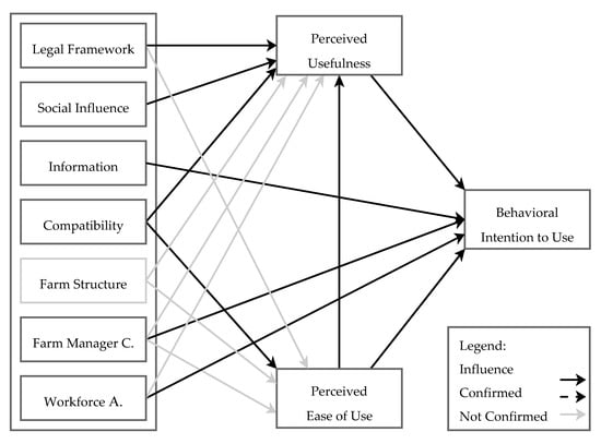 In conclusion, it was found that due to the scope of the topic, many factors influence the acceptance of farmers from the AgTech startups’ point of view. In general, the assumed relationships in the TAM were not only confirmed, but also supplemented by a new factor (farm structure) and several new relationships, which once again demonstrates the transferability of the TAM to various problems of agricultural acceptance research (see also []).