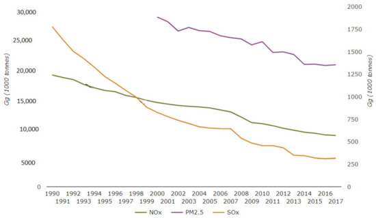 Figure 1 shows the emissions of the main air pollutants (NOx, PM2.5, and SOx) in Europe (1990–2017)