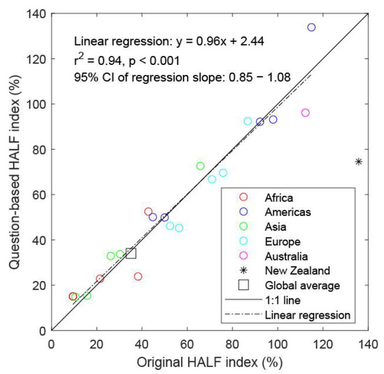 The results from the question-based HALF index calculator for the national and global HALF indices were plotted against the HALF indices found by Alexander et al. [16], as can be seen in Figure 1. A regression analysis showed a significant correlation (p < 0.001, r2 = 0.94) between the HALF indices found in this study and the HALF indices found by Alexander et al., with this relationship described by the linear regression equation y = 0.96x + 2.44. The 95% confidence interval of the regression slope is 95% CI [0.85–1.09]. The original HALF index calculated for New Zealand was considered a mistake in the calculation of the original HALF index and therefore excluded in this analysis.