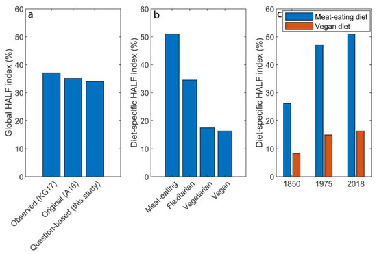 Figure 2. (a) The observed global HALF index in 2015 as calculated by Klein Goldewijk et al. (KG17), the global HALF index in 2016 as calculated by Alexander et al. (A16), and the global HALF index in 2018 as calculated in this study [1,16]; (b) The HALF indices for a meat-eating, flexitarian, vegetarian and vegan diet as calculated in this study; (c) The HALF indices for a meat-eating and a vegan diet overt time as calculated in this study.