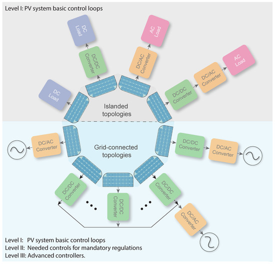 General scheme of photovoltaic (PV) systems topologies and their control levels.