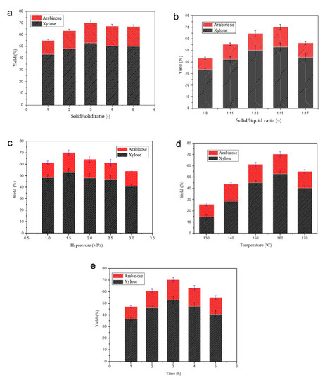 The effect of catalysts is of particular importance as catalysts drive the hydrogenation reaction. The amount of catalyst added and the transport process of catalyst and raw material in the medium influence the effective contact between the catalyst and the material. Figure 1a illustrates the effect of catalyst-to-rice straw solid/solid ratio (1:1 to 1:5) on hemicellulose conversion with the other conditions remaining constant (H2 pressure of 1.5 MPa, stirring speed of 600 r/min, temperature of 160 °C, time of 3 h, and solid/liquid ratio of 1:15). The xylose and arabinose yields increased with an increase in the amount of catalyst used. The optimal solid/solid ratio was 3:10, beyond which the yields decreased.